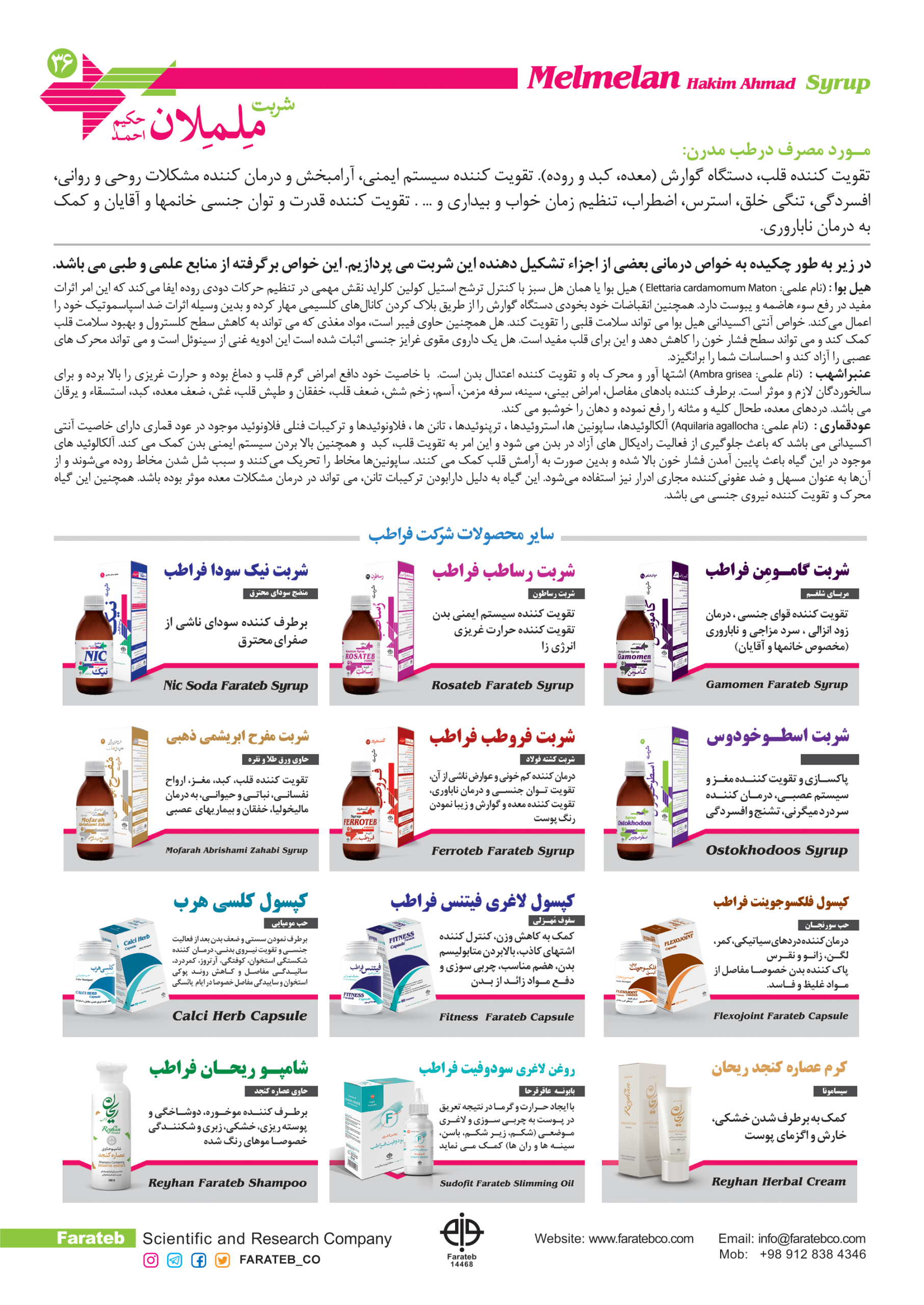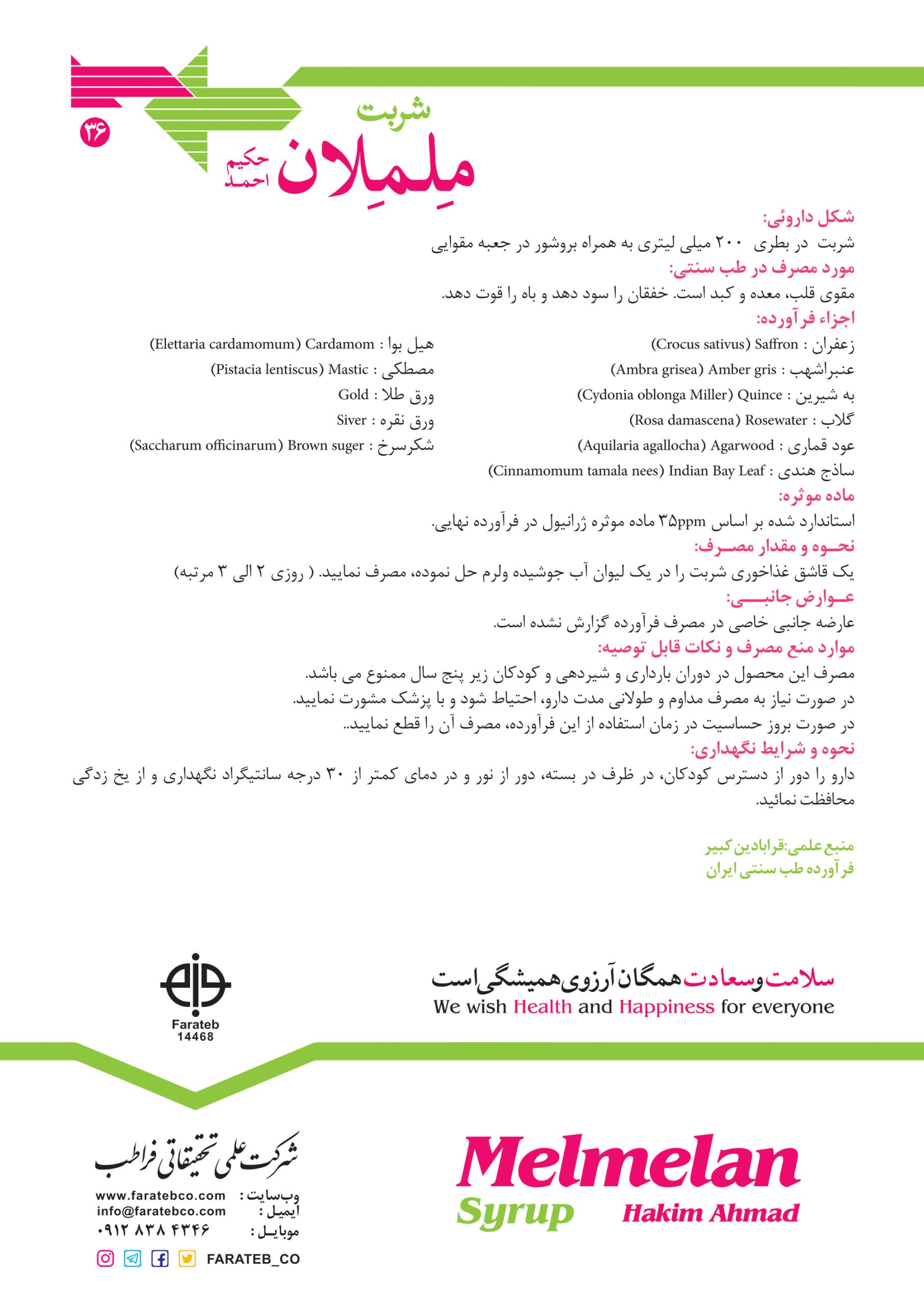 مشخصات کامل شربت ململان حکیم احمد فراطب؛ تقویت قلب، معده و دستگاه گوارش