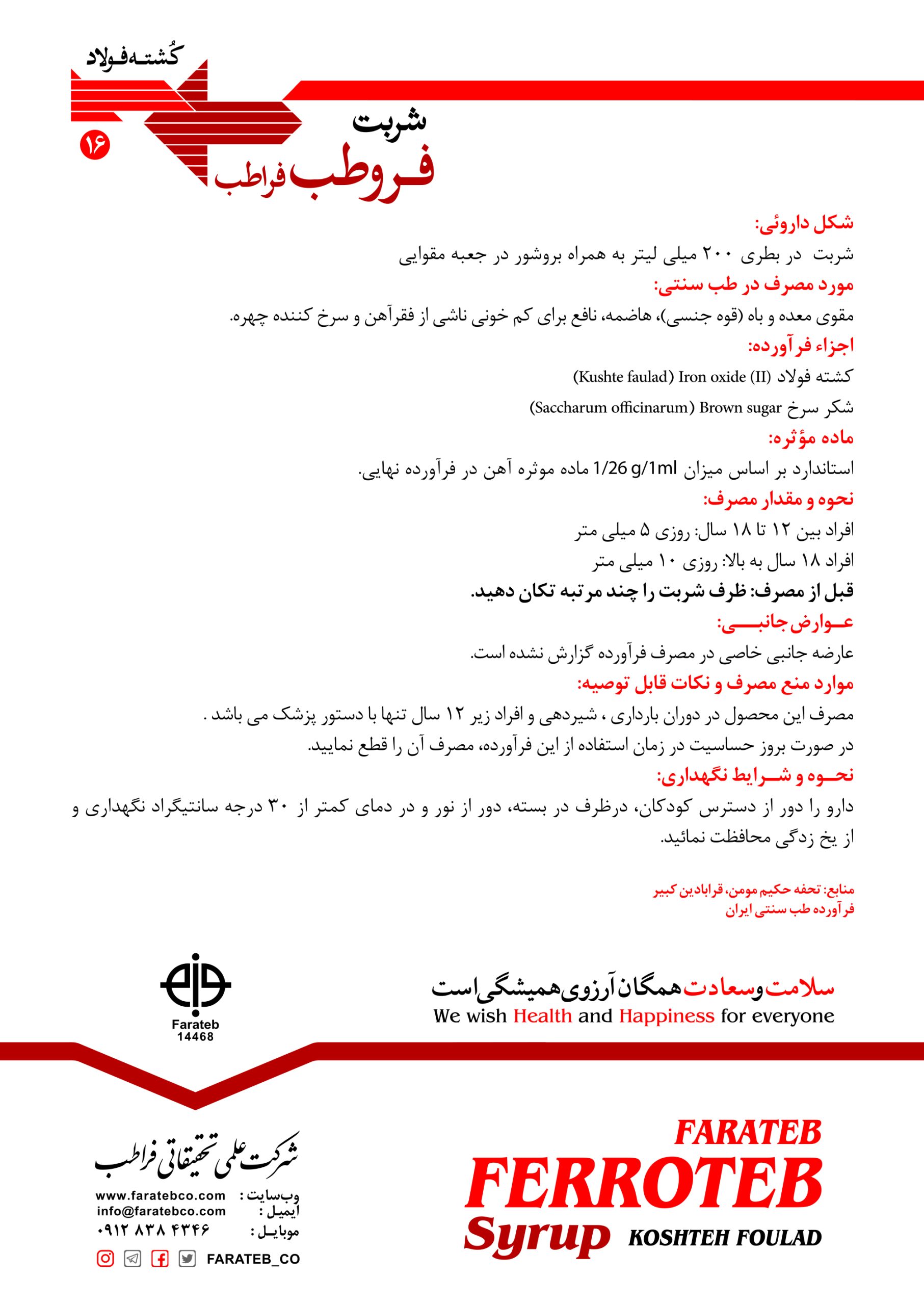 شربت کشته فولاد فروطب فراطب با بهره گیری از ترکیب منحصر به فرد کشته فولاد فرآوری شده و گیاهان تقویتکننده خون، به طور ویژه برای درمان کم خونی ناشی از فقر آهن و علائم همراه آن طراحی شده است.